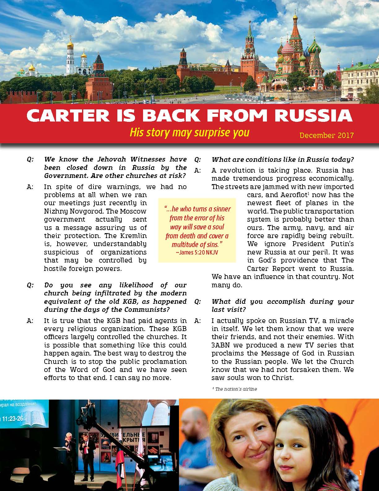 A: A revolution is taking place. Russia has made tremendous progress economically. The streets are jammed with new imported cars, and Aeroflot (the nation’s airline) now has the newest fleet of planes in the world. The public transportation system is probably better than ours. The army, navy, and air force are rapidly being rebuilt. We ignore President Putin’s new Russia at our peril. It was in God’s providence that The Carter Report went to Russia. We have an influence in that country. Not many do.