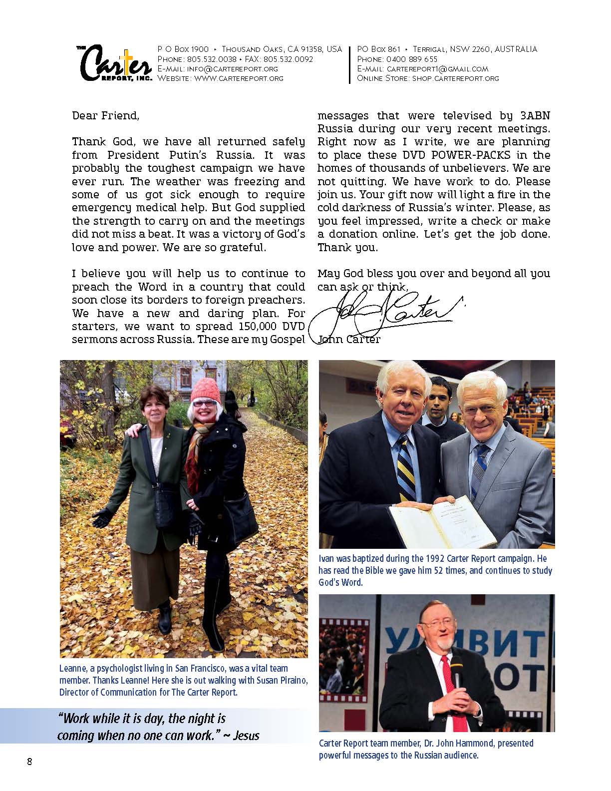 I am sending you $75.00 in U.S. funds for your campaign in Russia in October. I believe in the great work you are doing to spread the Gospel to the world. Pastor John, I will be supporting your ministry for I believe in it. May God continue to bless you in your service for Him.