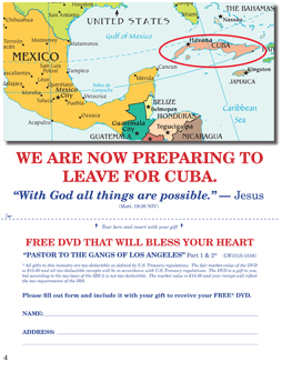 I am asking you to be my faith partner in raising one million dollars for the proclamation of Christ to the Cuban people. All can do something. Jesus will provide. May God bless you over and beyond all you can ask or think. Please write today.
