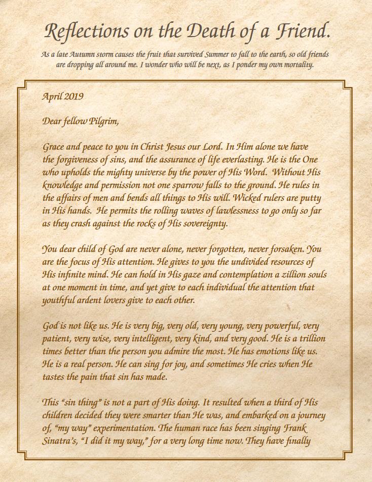 All this is true. These few words I have written are a synopsis of what I have studied for more than 60 years in His book, the holy Bible. These truths are what sustain me. They give me light in darkness, and comfort when I hear the news that another old friend has died. Safe in Christ. Glory at the Homecoming. No more tears.